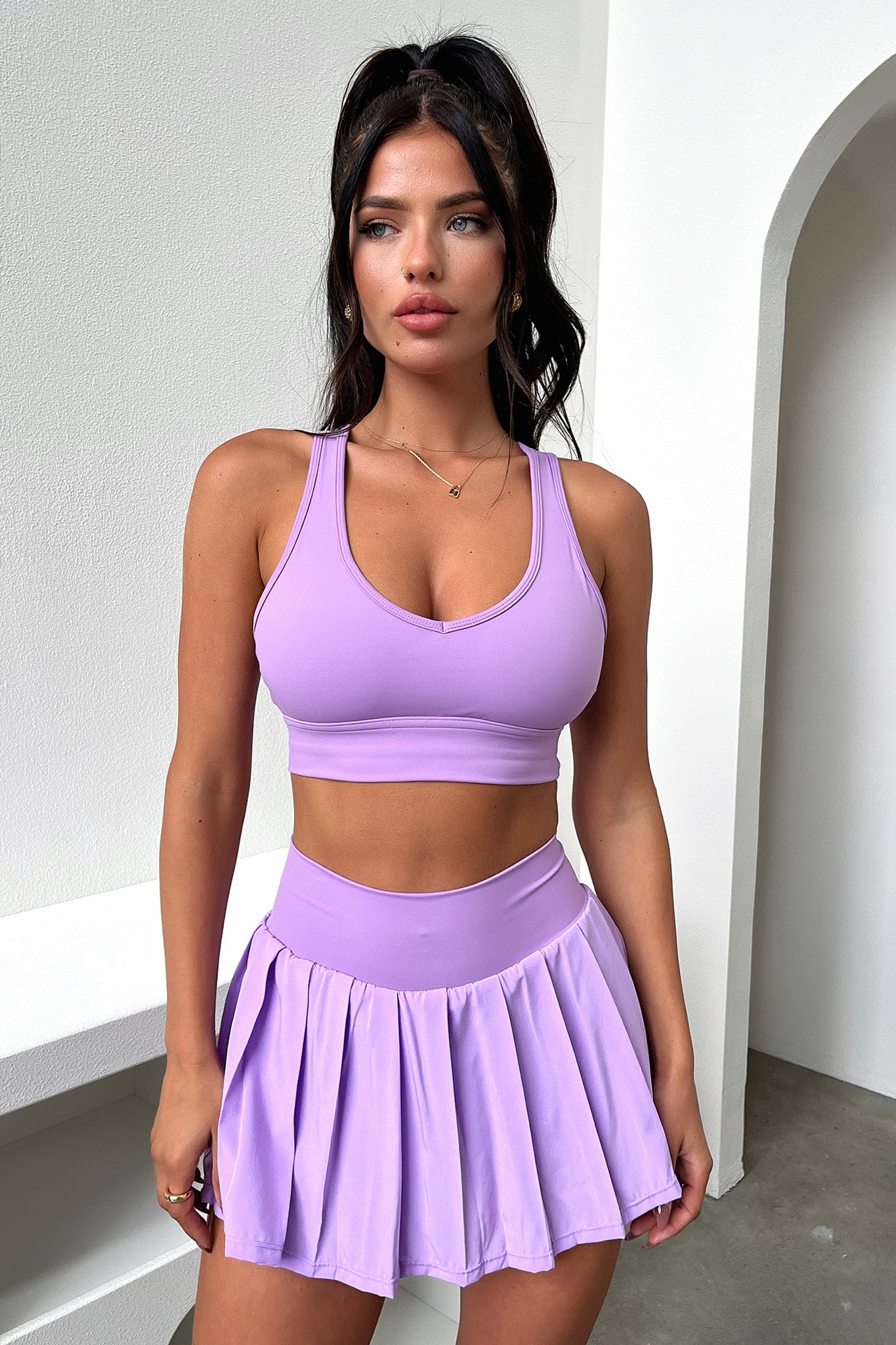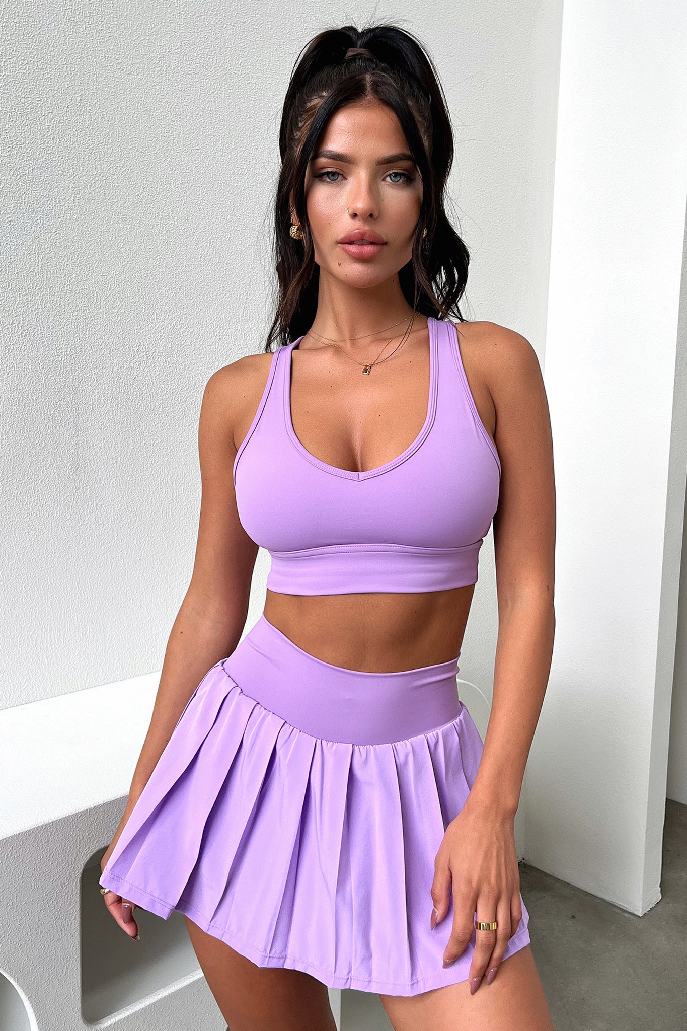 Step up your sporty style with our Alani Tennis Skort! With a stretchy elasticated waistband to keep you comfortable. a pleated skirt with two side pockets in the shorts underneath. and our TSF logo on the back. you'll be looking fly on the court. Style her with the matching sports bra for an unbeatable off duty look!