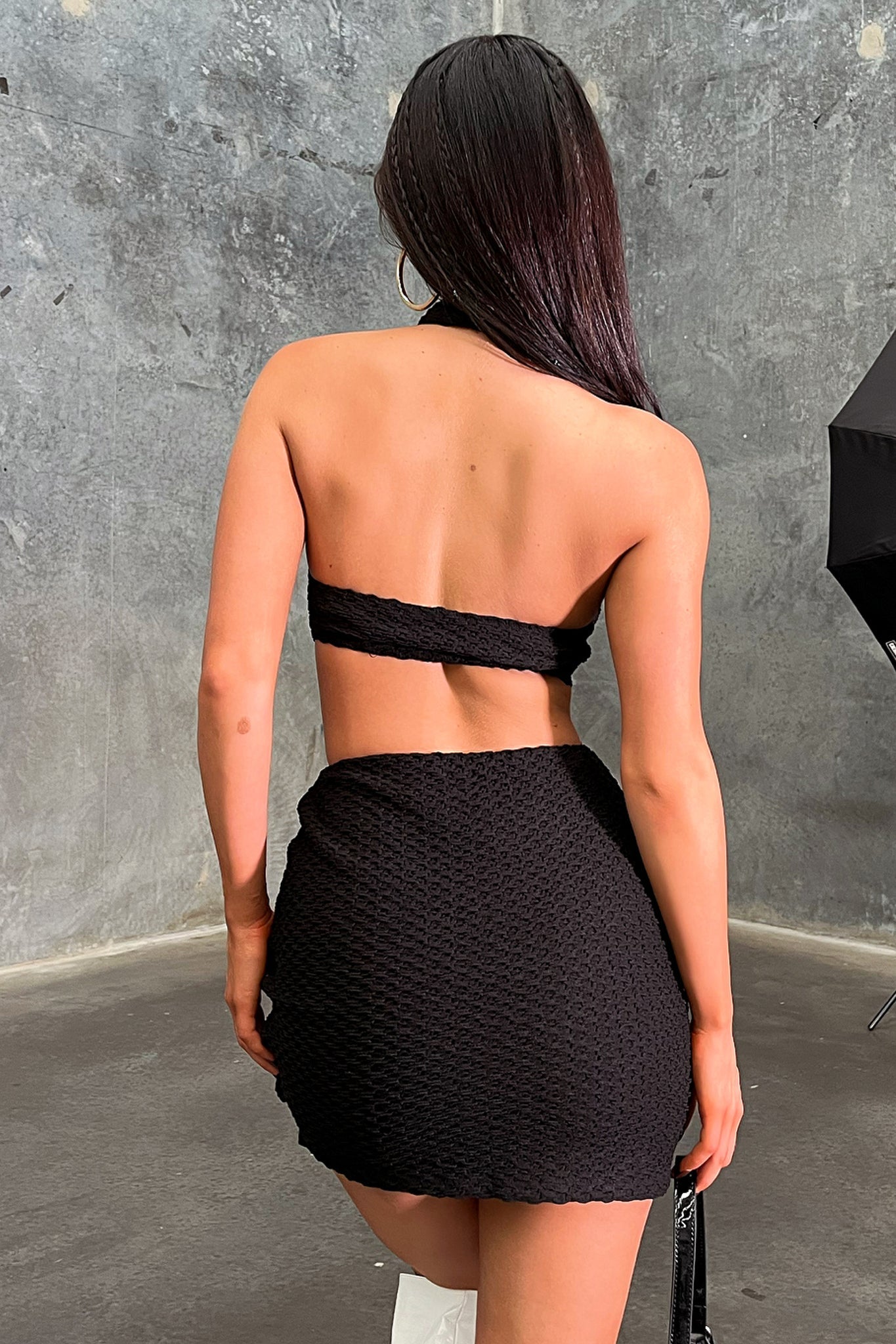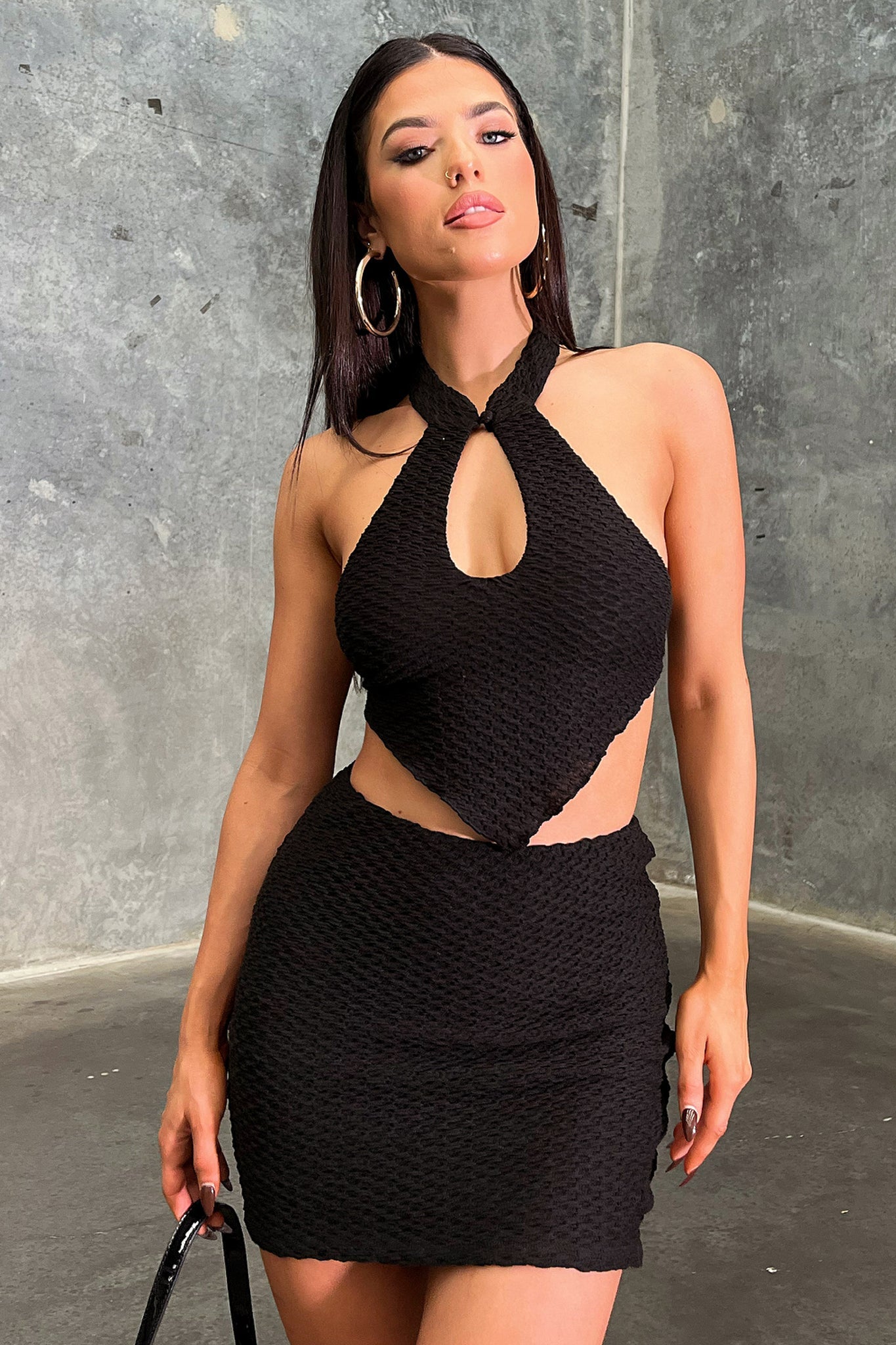 Sweet and Glamorous! The Ally Crop offers a stretchy textured material. a high halter neck with a button detail at the front and double lined material. Style her with the matching skirt and some boot for a killer look.