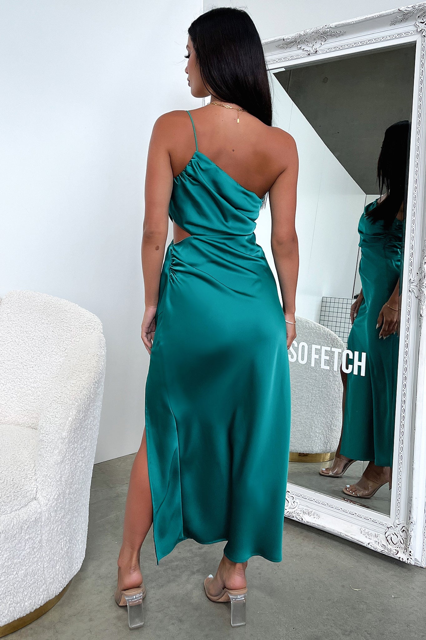 Add a touch of sophistication to your wardrobe with the timeless Antonella Maxi Dress. She features a one shoulder spaghetti strap. a side cut out. an invisible side sipper. double lined bust and a cheeky side slit. Perfect for a special occasion. paired with black heels and statement earrings for an elevated look!