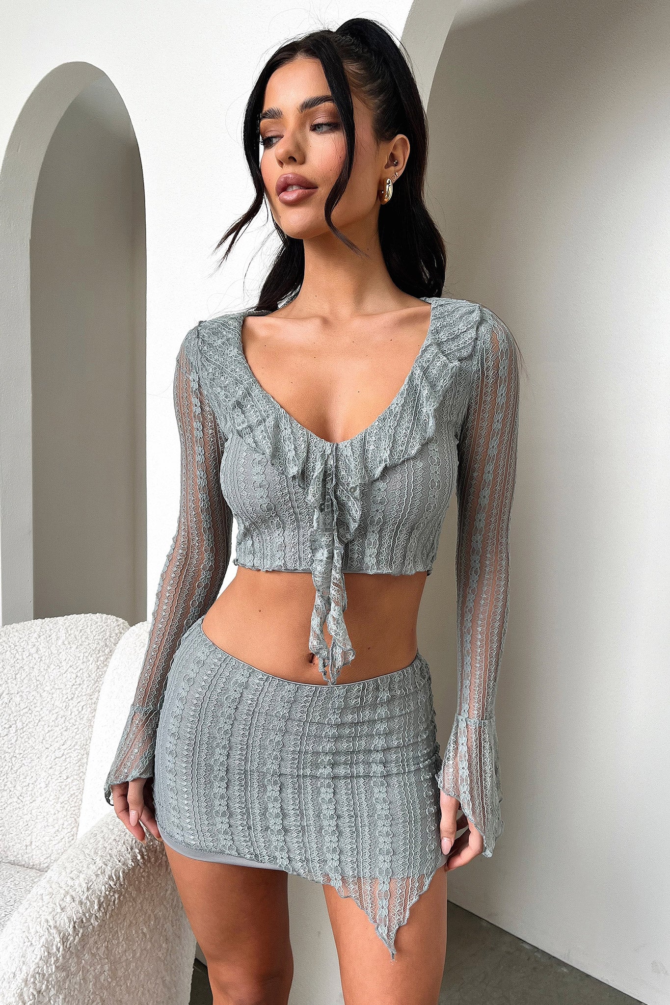 Add a splash of pizzazz to your wardrobe in the Aperol Skirt! The perfect blend of sweet and sassy. this mini number features lettuce trim edges. double lining and a stretchy waistband to keep you comfy. Plus. the lace material is sure to add some va-va-voom to your style! Get ready to shimmy and shake in this fab skirt! Pair with the matching top and your go to heels!