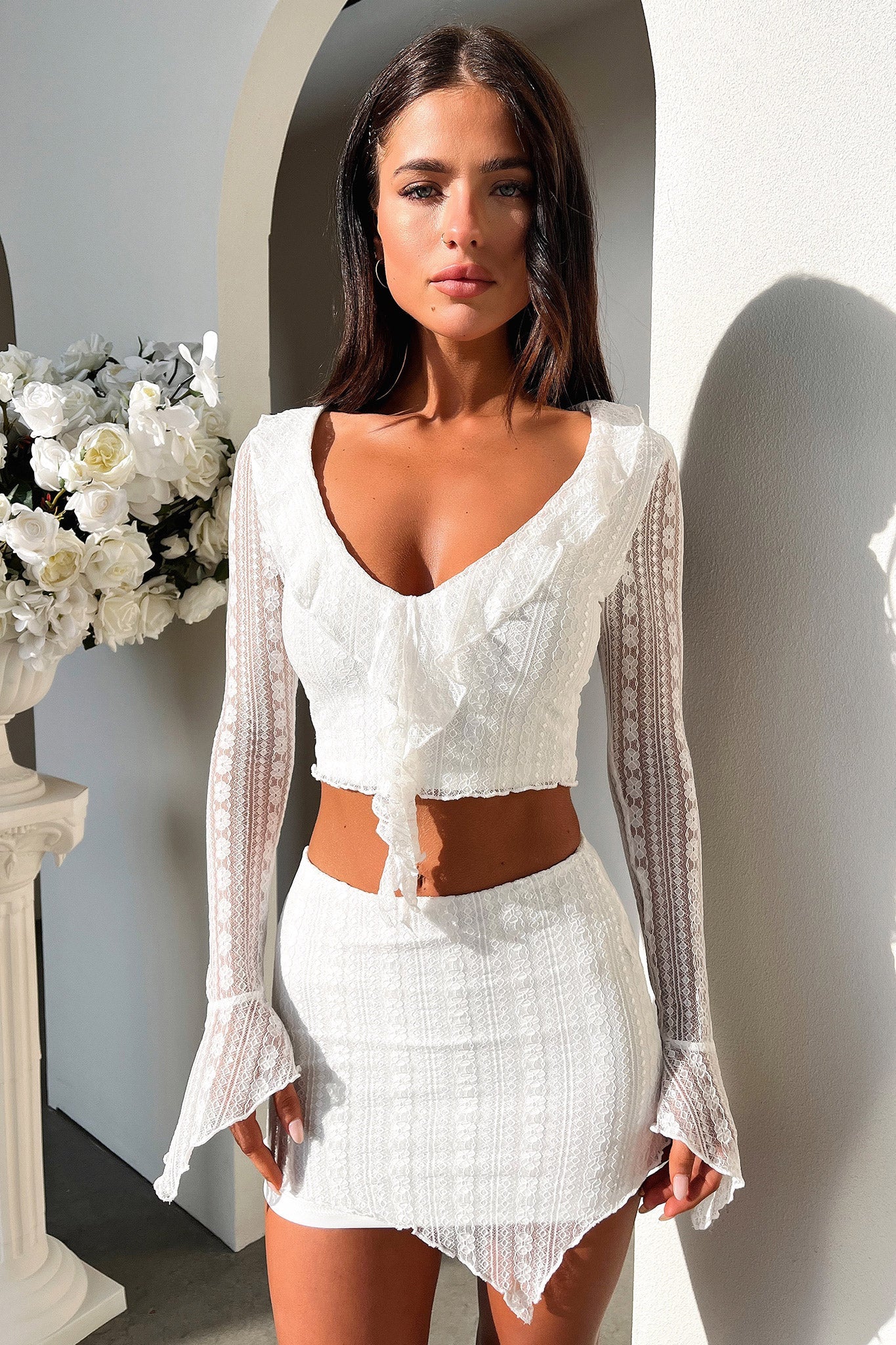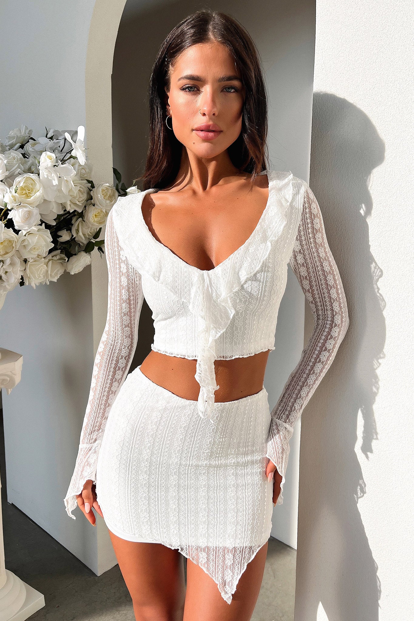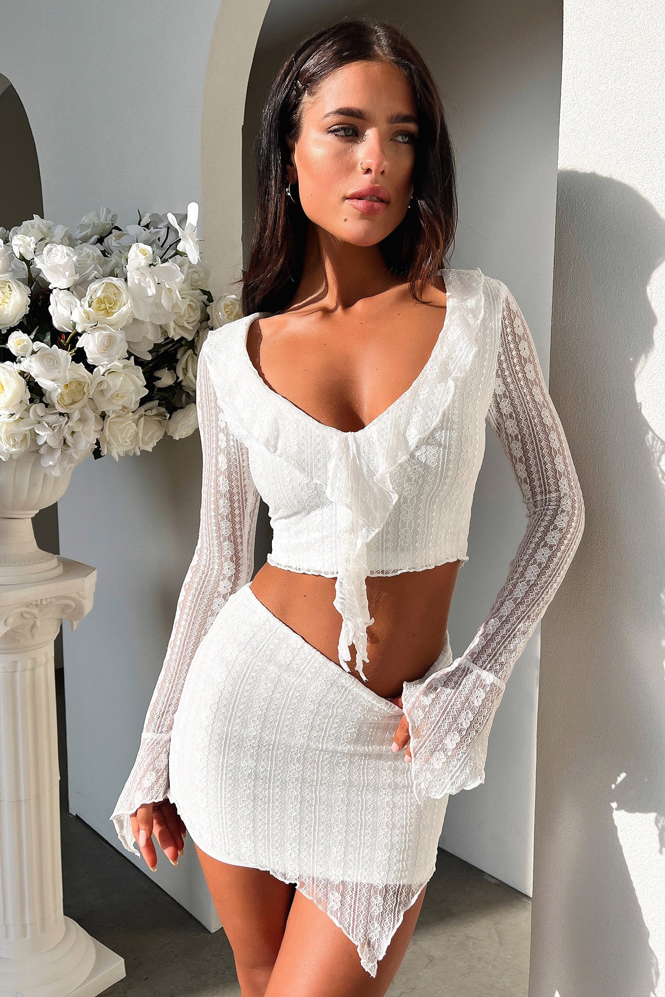 Add a splash of pizzazz to your wardrobe in the Aperol Skirt! The perfect blend of sweet and sassy. this mini number features lettuce trim edges. double lining and a stretchy waistband to keep you comfy. Plus. the lace material is sure to add some va-va-voom to your style! Get ready to shimmy and shake in this fab skirt! Pair with the matching top and your go to heels!