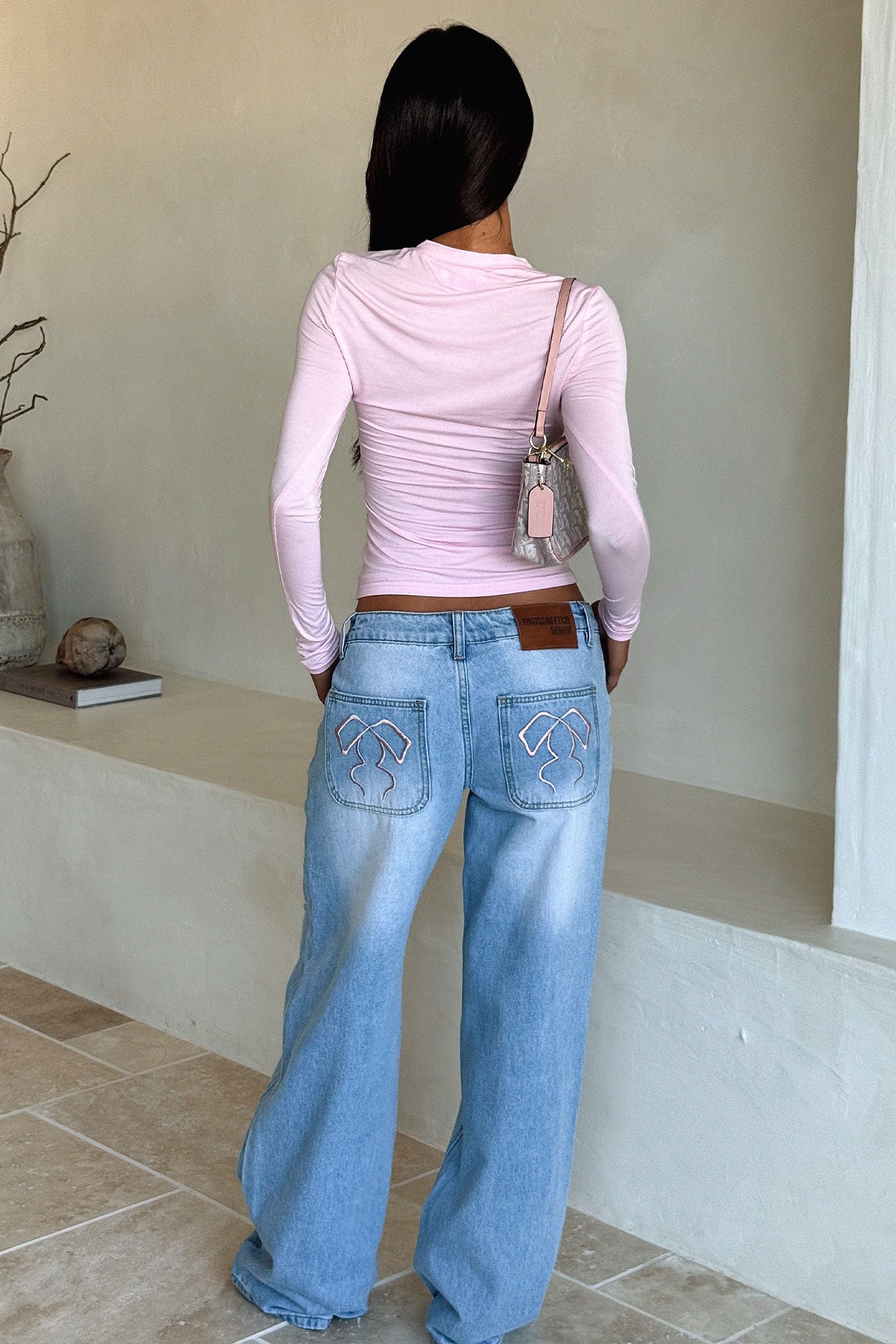 Mix comfort and style with the Avelyn Low Rise Jeans in blue! Featuring a trendy wide leg fit and playful rips. these jeans stand out with pink bow embroidery on the pockets and a signature Coutiqo leather patch. Designed with belt loops. a double snap button. zip front closure. and four functional pockets. they blend practicality with flair. Pair them with a cute crop top and sneakers for an effortlessly cool. casual look!