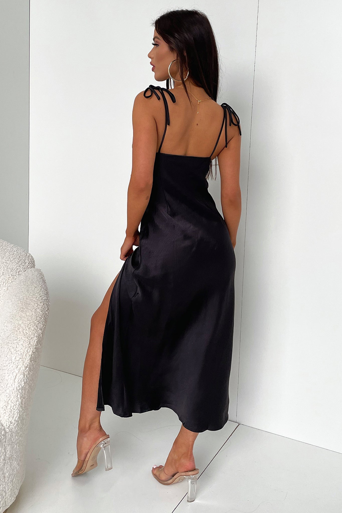 We've got your formal needs covered with the gorgeous show stopping Bailey Dress in Black. She is such a darling. featuring a gathered bust. a silky soft satin fabric all over. dainty. tie up spaghetti straps and a cheeky split on the left leg. She's perfect for any formal event paired with black heels. dainty silver jewellery and a mini clutch for an elegantly beautiful look.