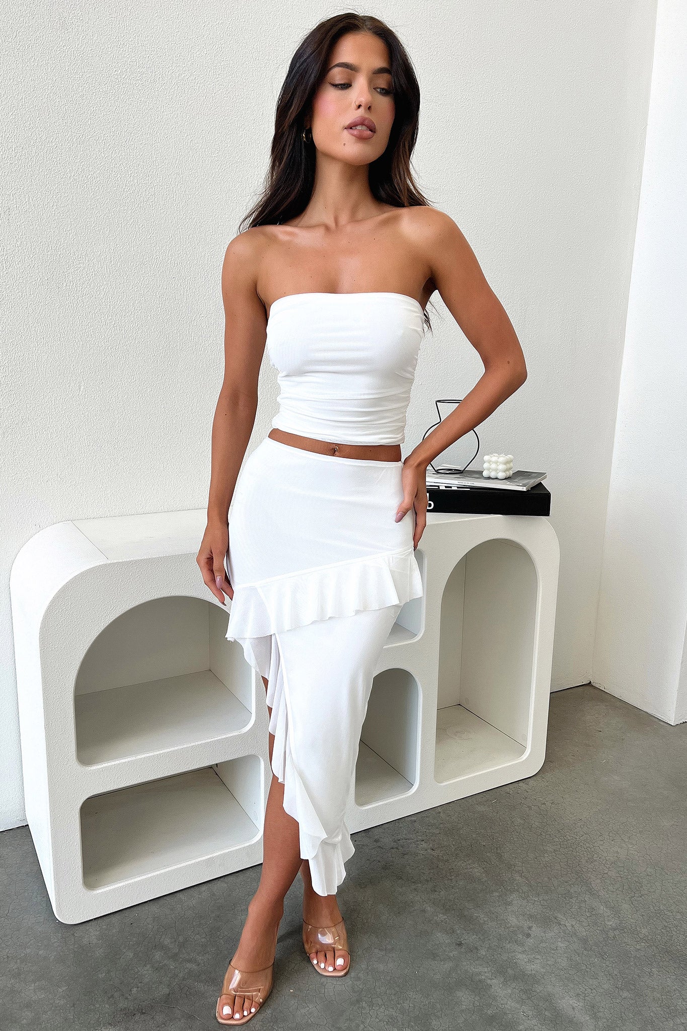 Add some flirty fun to your wardrobe with the Cardona Skirt! This midi-length skirt features frill detailing. double lining. and an asymmetrical hem for a truly unreal look. Paired with the matching top. you'll be ready to raise the roof!