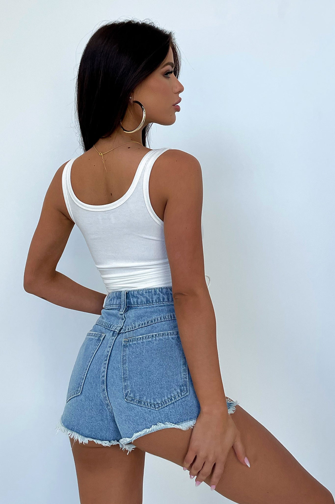 keeping it cool with these hot denim shorts! The Diego Denim shorts feature a distressed denim look with rips at the edges. a button and zip closure. belt loops all around the waist and two front and back pockets. She looks best paired with a cute crop and sneakers for a casual Sunday brunch with the girls.